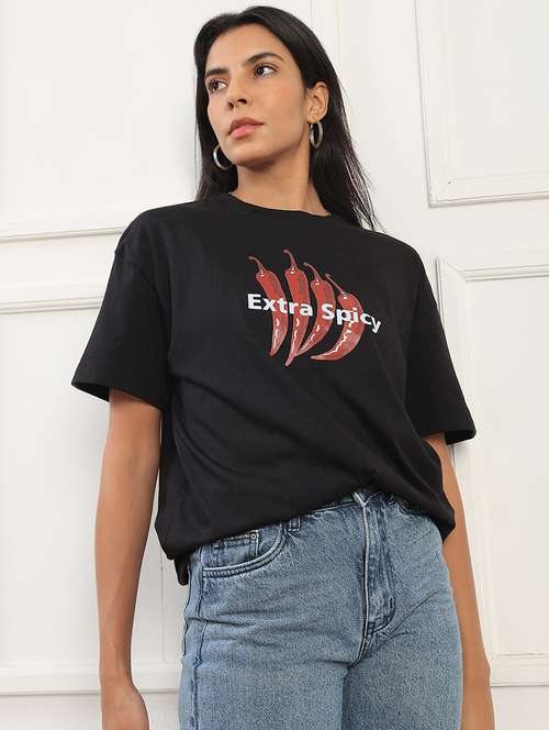 - » globus women black round neck drop shoulder sleeves graphic print oversized t-shirt