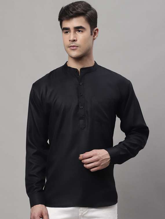 Black Solid Short kurtas, Black straight above knee kurta, has a mandarin collar, long sleeves, Curved hem,