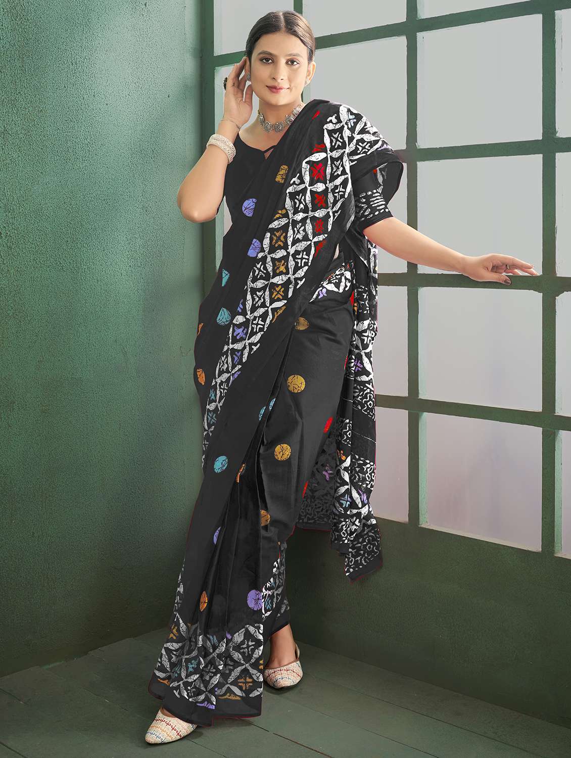 Black printed 100% mulmul pure cotton saree with blouse.One of the most graceful costumes made from unstitched saree much loved choice for most Indian women can be worn in so many different ways. With the right material and drape, it can accentuate the beauty of women of all ages and forms. Be it a festival or a wedding, sarees are a hot favorite worldwide, and it’s easy to see why. Sarees give you the opportunity to give a modern touch to a traditional Indian attire.