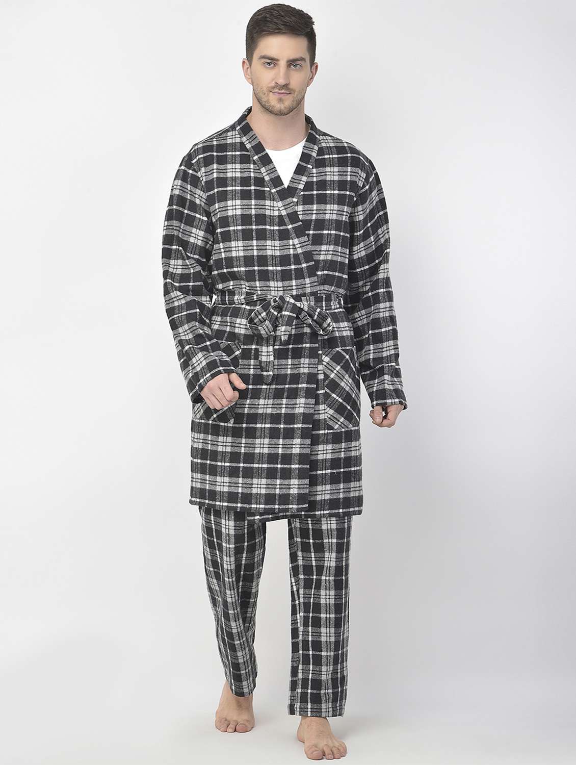 This season wear some easy fashion. Granish black brush checks men robe meld with soft breathable fabric. It is fashioned with an all-over brush check, long sleeves, and a tie knot belt for good fitting. Marked the new style in your restful zone this season.