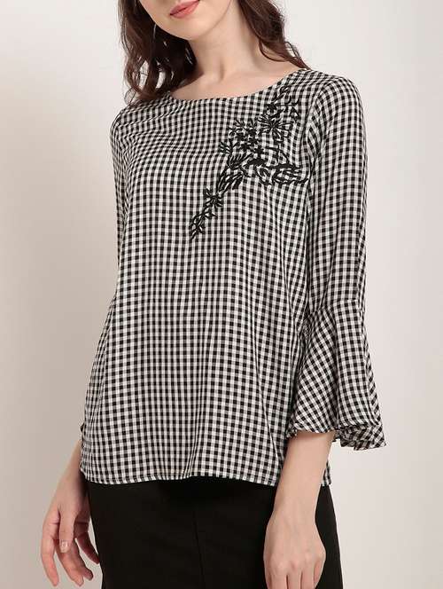 - » checkered embroidered flute sleeved top