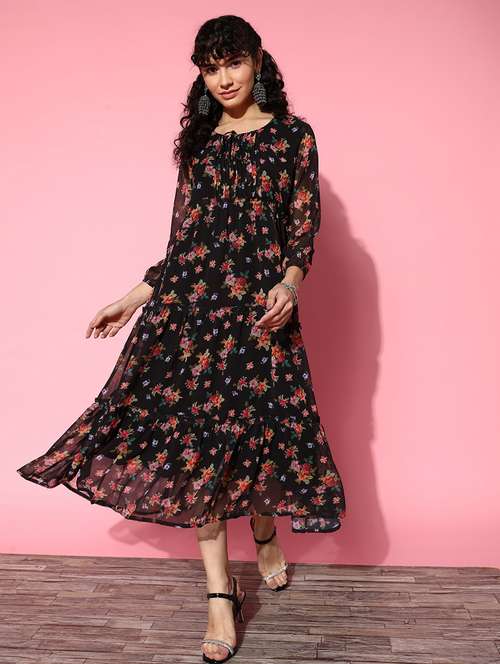 - » black florals printed round neck dress