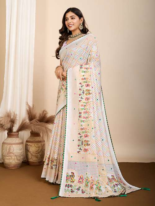 We offers Printed Fancy Bollywood Fashionable Saree with Rich intricate Digital Print work and Embroidered Touch up work at all over Body, Border & Grand Pallu. Blouse, Border and Pallu have very fine contrast color matching with Saree body. Saree have beautiful Artificial Mirror work arround saree and Pallu have lagdi patta concept design with beautiful Zalar work. Saree & Blouse Material is Maslin Cotton which very Soft and Skin Friendly material. This Saree Has a Length 6.30 Meter Which Includes 0.8 meters of the blouse. These new Bollywood designer fashionable saree for women can be used as Party wear saree, Festival saree, wedding saree on every Occasions. Product colour may slightly very due to photographic lighting sources or your monitor settings.