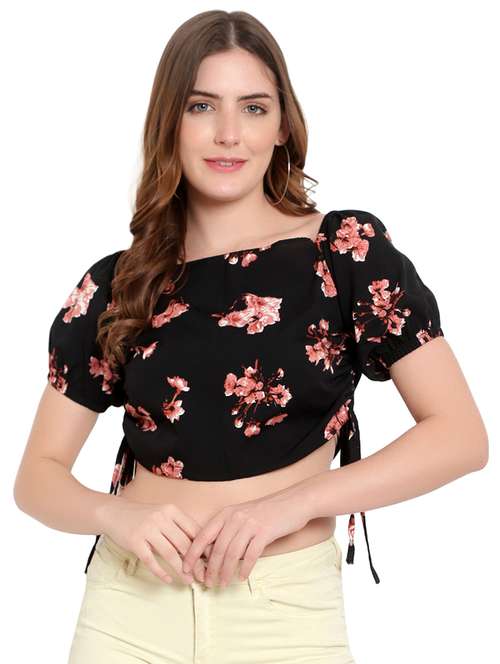 CROP TOP, CREPE FABRIC, SIDE DORI AND ADJUSTABLE BLACK COLORL FLORAL PRINTED CASUAL PARTY AND DAILY WEAR TOP