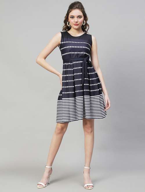 - » blue printed crepe fit & flare dress