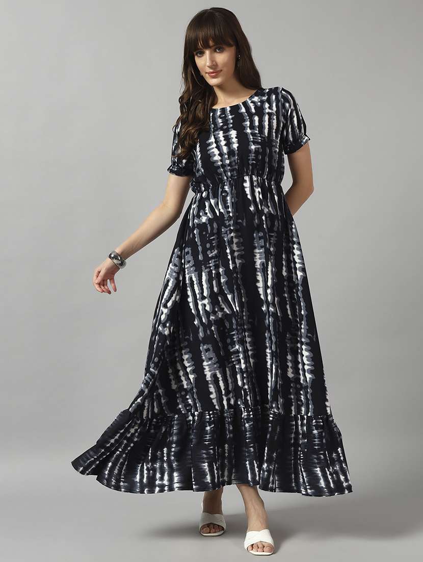 - Dress up in a soothing pattern and don this dress made of crepe material.