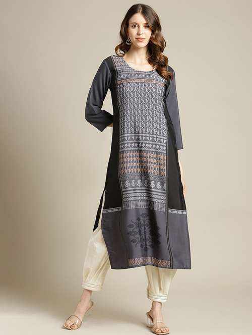 - Grab this beautiful kurta made up of crepe fabric featuring round neck designs.