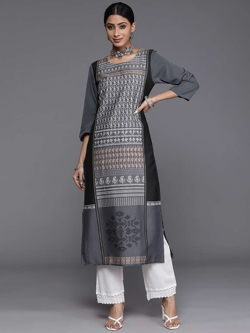 - Grab this beautiful kurta made up of crepe fabric featuring round neck designs.