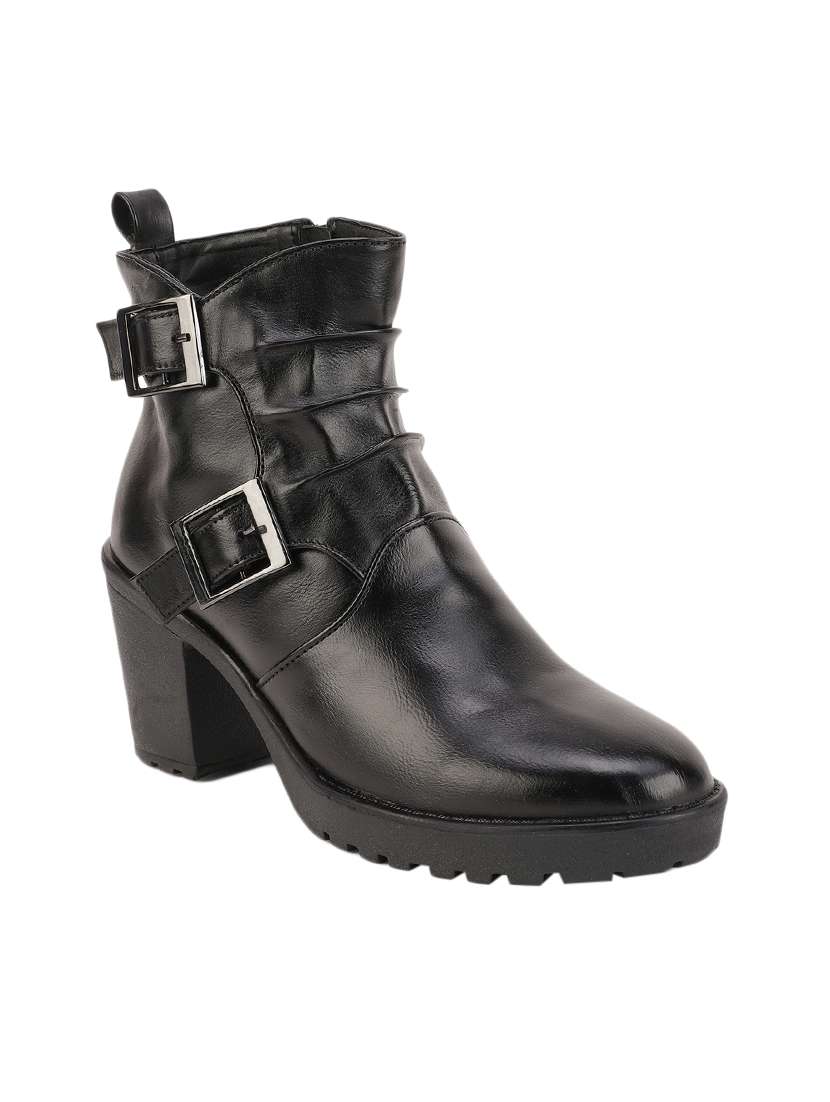 Latest Boots Collection From A Premium Brand Bruno Manetti. A Pair of Women's Comfortable & Fashionable Black Color Side Buckle Zip Closure Mid Ankle Length Synthetic Leather Round Toe Block Heel Boots Having PU Insole & TPR Sole Material.