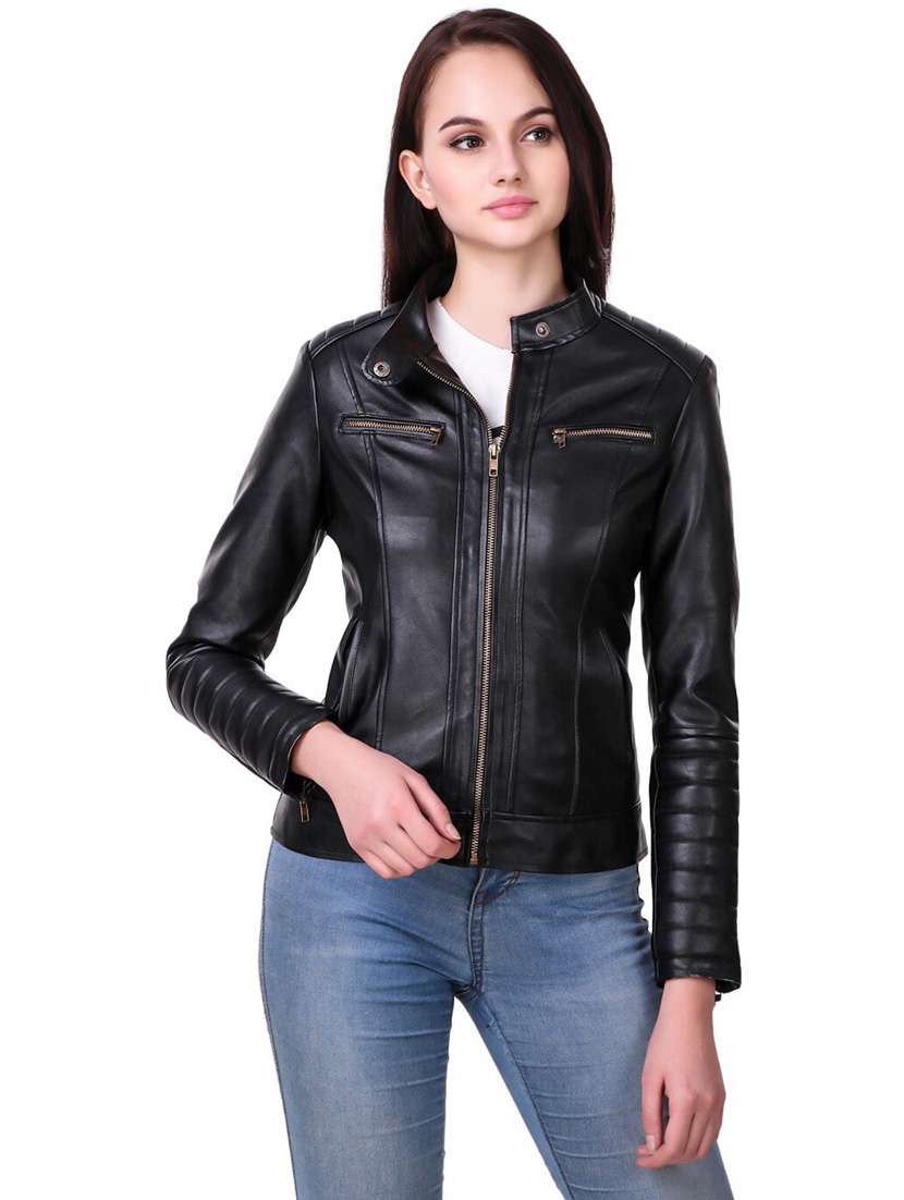 - » women black solid long sleeve biker jacket