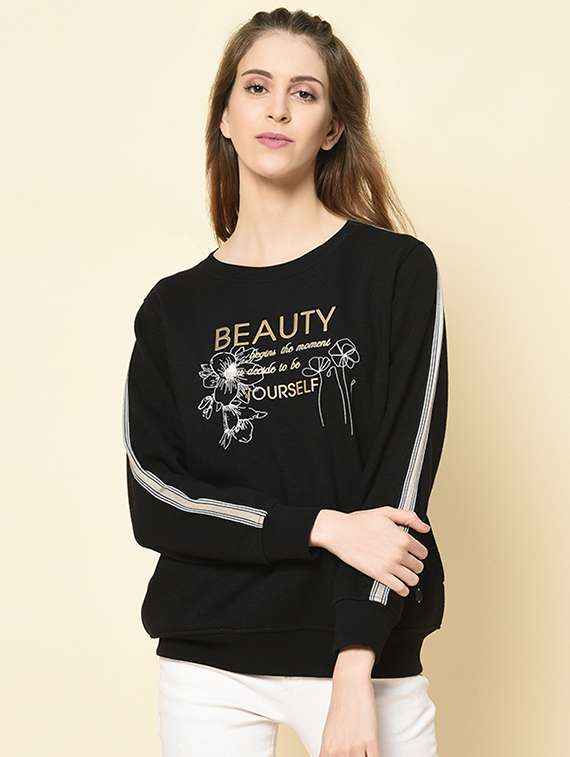 - Recreate your winter style with the all new frisky design options of sweatshirts available in black shades and hues to brighten up the chilly days.