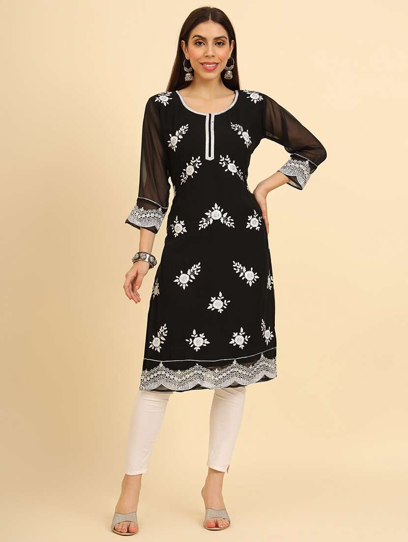 - Grab this beautiful kurta made up of georgette fabric featuring round neck designs.