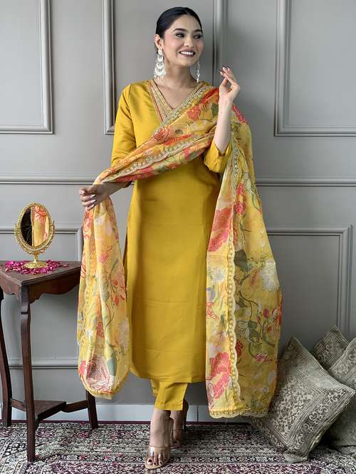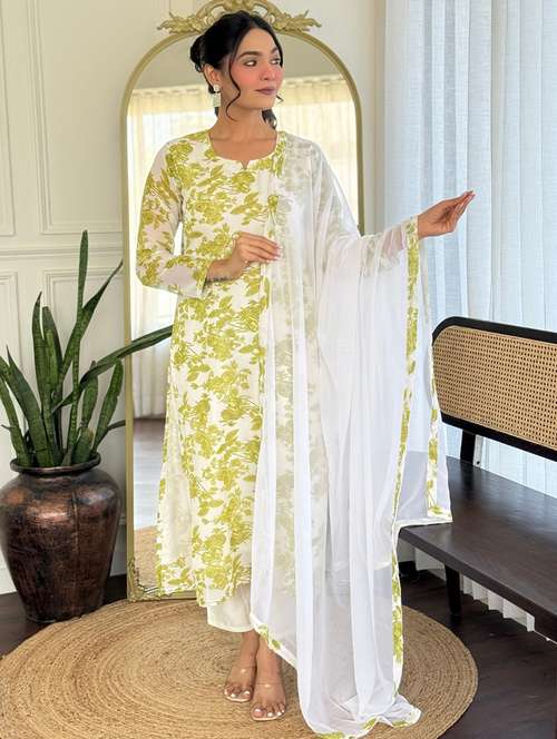 - Browse through the latest range of ethnic sets for women with tailored sleeve designs with traditional works.