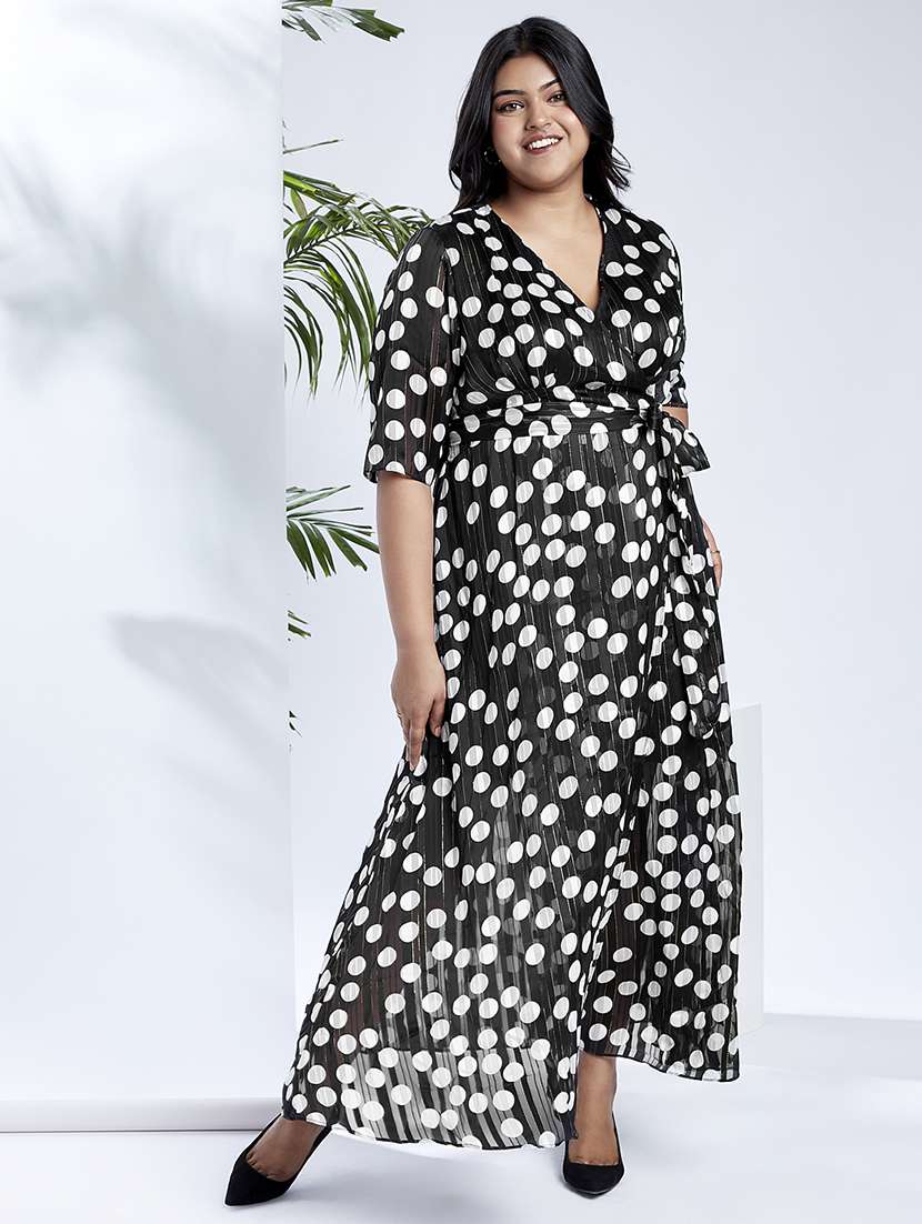 - » globus gloplus women black v-neck polka dots lurex detail waist tie-up plus size maxi party wrap dress