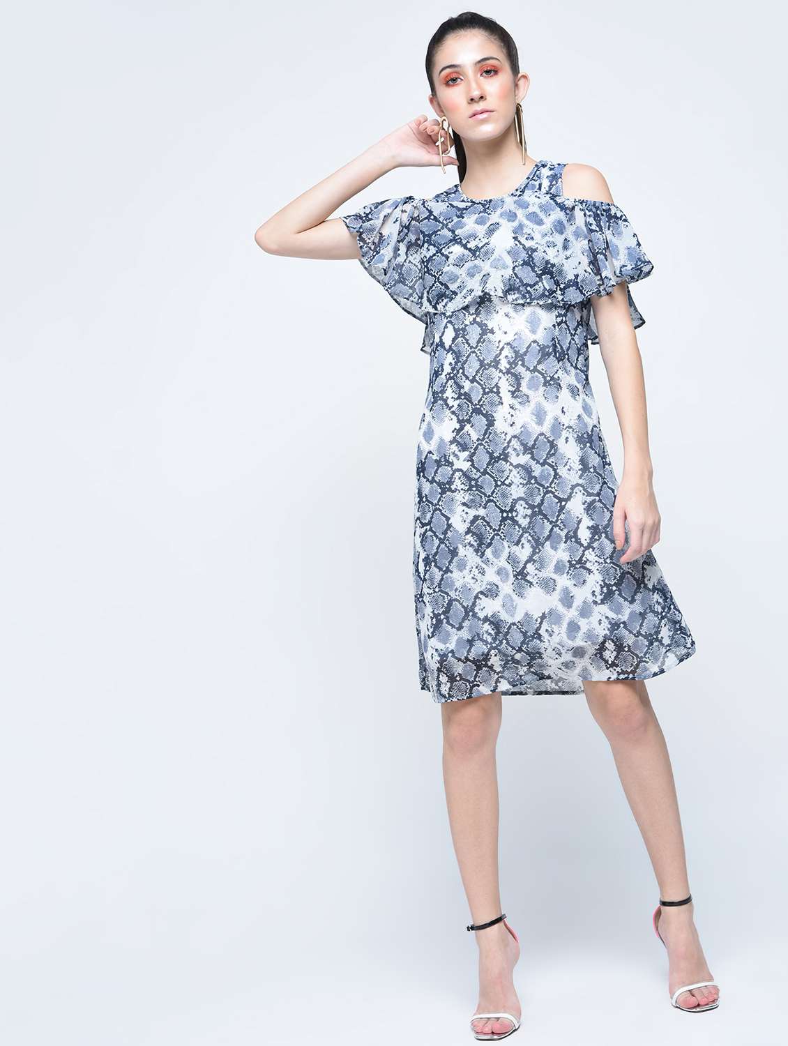 ruffled cold shoulder snake print dress