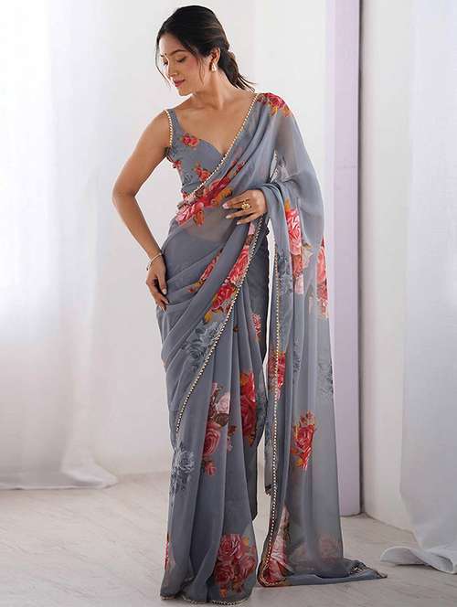 This elegant black georgette saree is adorned with delicate floral prints and a subtle bead work lace along the edges, creating a sophisticated and classy look. Made from lightweight georgette, it drapes gracefully while ensuring all-day comfort. The saree comes with an unstitched georgette blouse piece, allowing you to tailor it to your personal style. Perfect for parties and special occasions, this saree adds a touch of elegance to your ensemble. Slight variations in color or design may occur due to screen settings, making each piece uniquely charming.