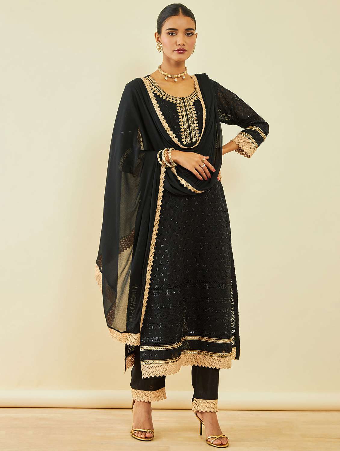 women black round neck kurta pant set with dupatta