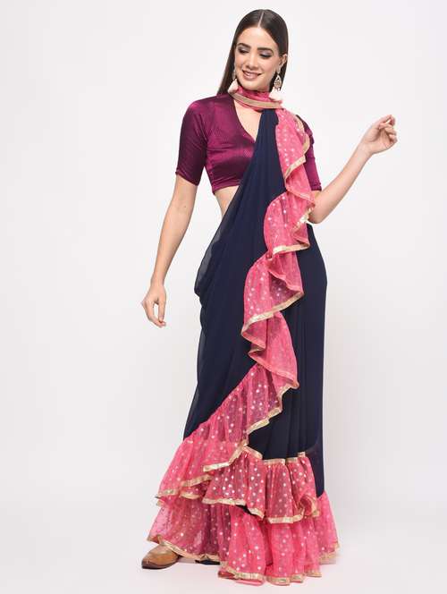 contrast ruffled plain saree with blouse