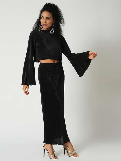 - » globus women black accordion pleats round neck bell sleeves crop top with side slit maxi skirt party co-ord set