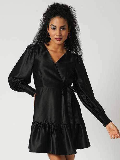 - » globus women black wrap neck cuffed sleeves tiered satin mini party dress
