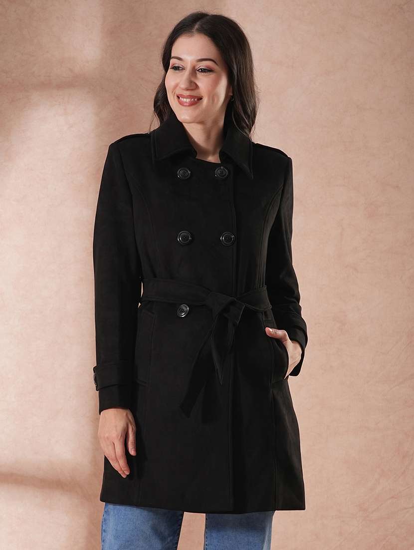 - » globus women black spread collar long sleeves self design double breasted 2 pockets tailored fit winter wear belted pea coat