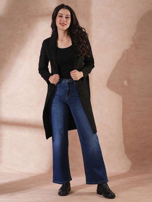 - » globus women black peak lapel long sleeves self design 2 pockets tailored fit winter wear belted pea coat