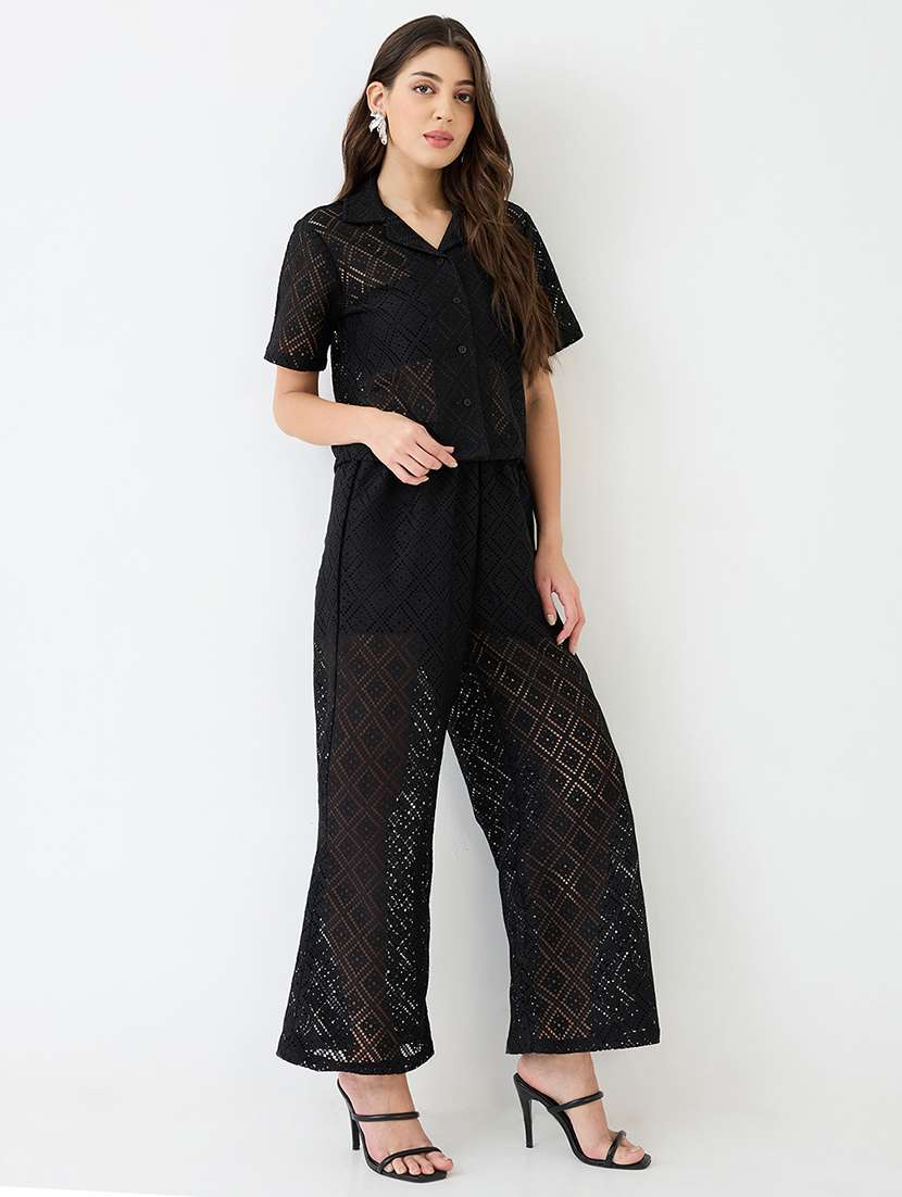 - » women black notched lapel short sleeves crochet shirt & wide leg trousers co-ord set