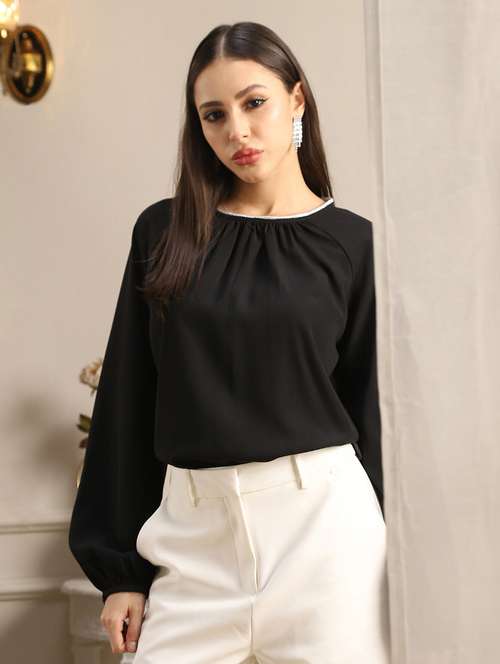 globus women black jewel neck raglan sleeves pleated detail georgette party top