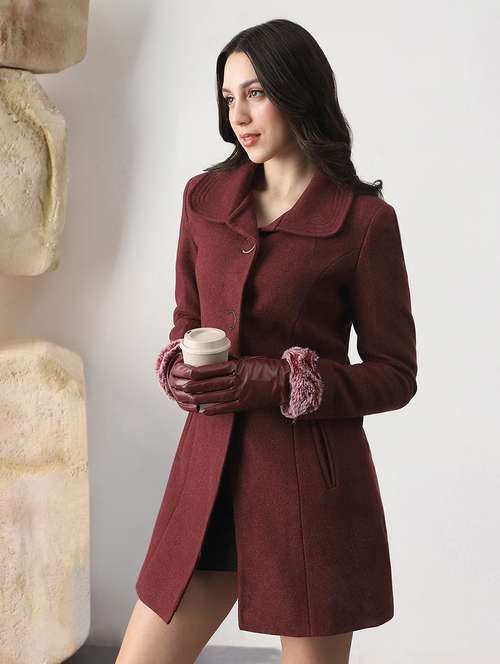 - » globus women black self design shirt collar long sleeve hip length tailored fit overcoat
