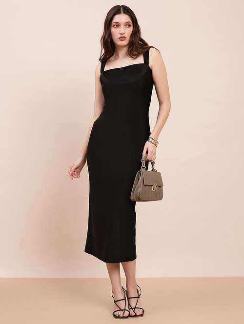 Step into timeless glamour with this sleek black bodycon midi dress designed to flatter your silhouette effortlessly. The chic square neckline and delicate strappy sleeves add a modern, minimalistic charm that enhances the dress’s bold appeal. Crafted for a smooth, contouring fit, it features a straight hem that keeps the look elegant and refined. A true wardrobe staple, this dress ensures you stand out at any evening event.