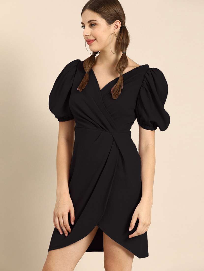 Black knitted Wrap Mini Dress, has a v neck, mini dress, puff sleeve women dress. Stylish look wrap dress for women