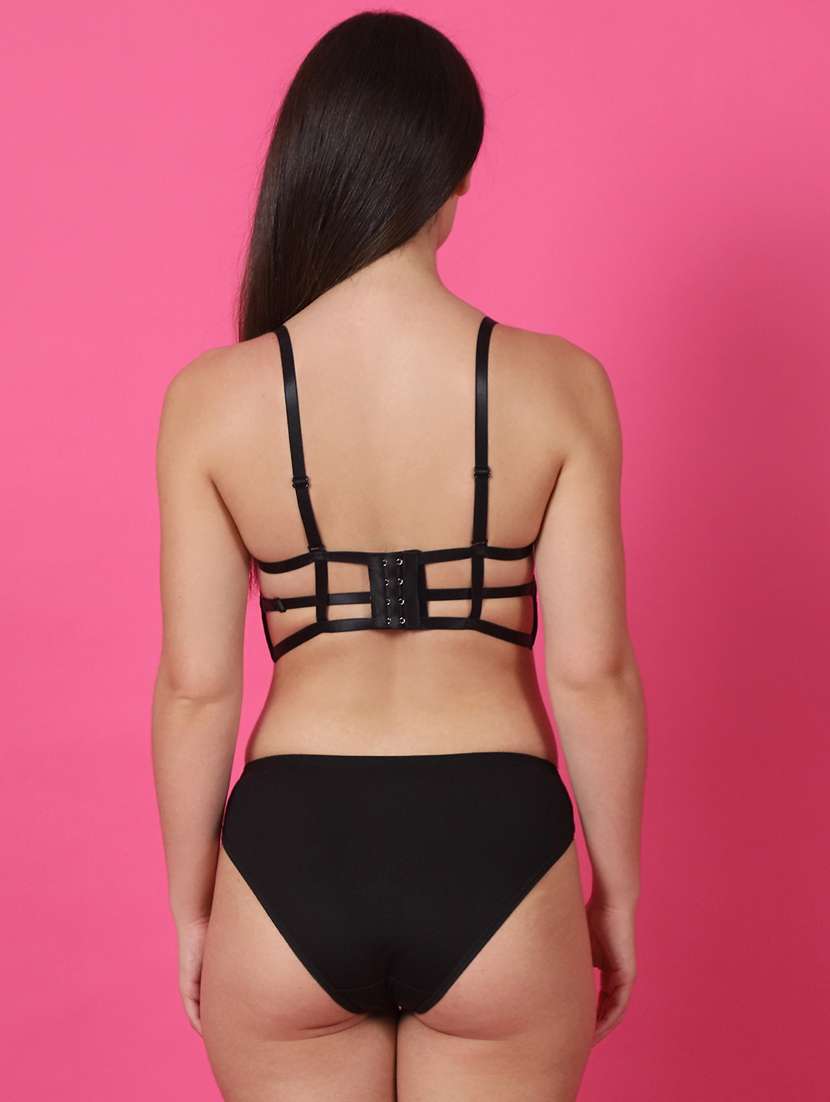 PrettyCat black bra with panty padded cups to protect modesty, Crafted with exquisite lace fabric, Underwired cups for a gentle lift, Balconette style for wide neck tops, Half coverage cups for low neckline dress, Can be worn as a strapless bra, Detachable straps to style the bra in multiple ways, Cute heart shape buck in the center for embellishment, Four hooks & eye in smaller/bigger cups respectively, Cage detailing on the front.