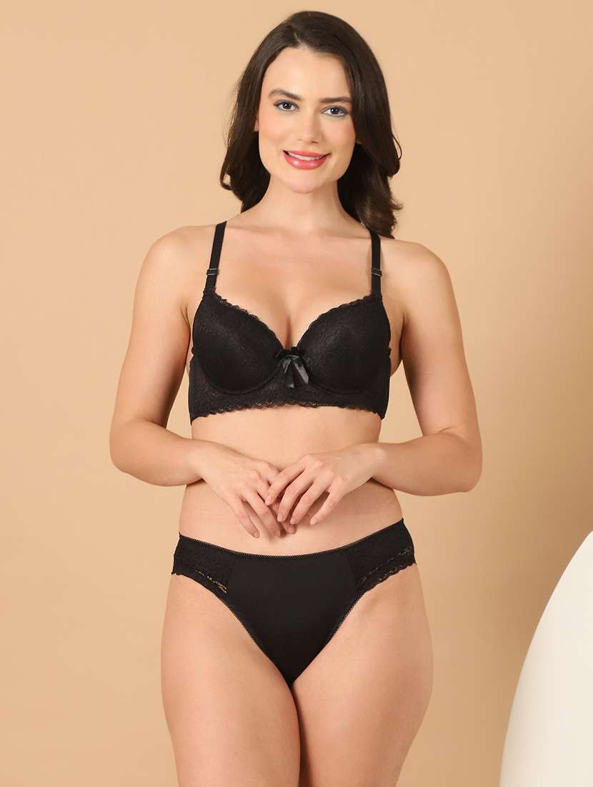 PrettyCat black bra with matching panty set Padded cups to protect modesty. Crafted with exquisite lace fabric on the cups & powernet at the centre gore, Designed with scalloped detailing at the neckline, Underwired cups for a gentle lift, medium coverage cups for no top or side spillage, Cute bow at the centre for embellishment, Secured with triple hook & eye enclosures at the back. Low waist bikini panty offering medium rear coverage, Crafted with soft fabric, Soft elastic at the waistband & leg openings for snug fit, Double layered gusset for hygiene.