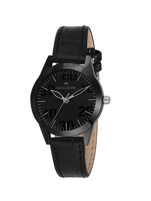 black dial black leather strap analog wrist watch