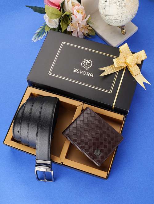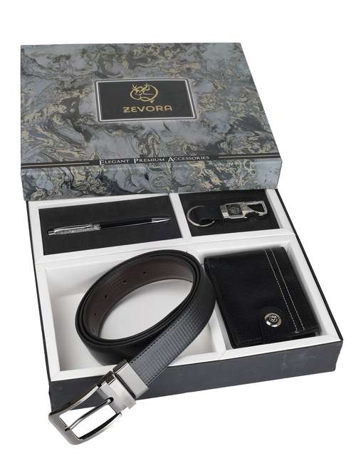 The Zevora Gift Hamper for Men is the ultimate combo gift set designed to impress. This pack of four includes a sleek leather belt, a stylish wallet, a practical keychain, and a sophisticated pen, making it a perfect choice for any occasion. Crafted with premium materials, the leather belt and wallet exude elegance and durability, ensuring long-lasting use. The keychain adds a touch of class and convenience, keeping keys organized. The pen, with its smooth writing experience, complements the set, making it ideal for professionals and daily use. Packaged in an elegant gift box, this set is perfect for birthdays, anniversaries, or any special celebration. Show your appreciation with the Zevora Gift Hamper for Men, a thoughtful and practical gift that combines style and functionality.