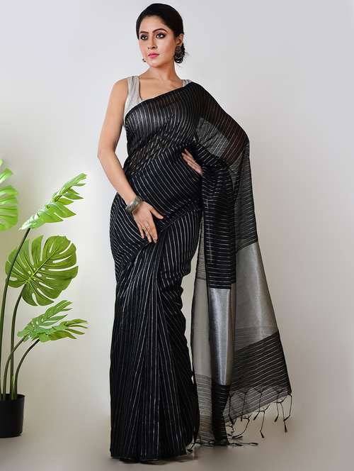 Aakar Nritya Nupur Black Handloom Linen Saree with White Zari Stripe