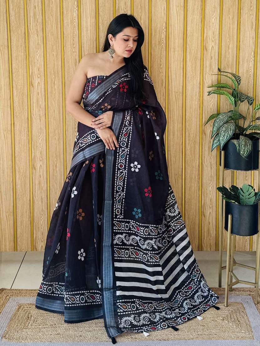 Black Linen Cotton Digital Print Saree With Printed Pallu