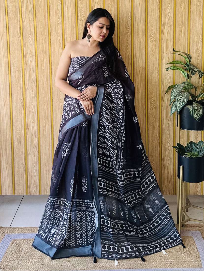 Black Soft Linen Cotton Digital Print Saree With Printed Pallu