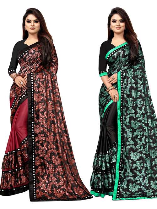 This Multi Color Combo offer Saree has printed Frill and Sequence Lace Border. We offer High Quality Range of Printed Sarees that is Designed by our team of Creative Professionals and at the same time perfect mix of modern patterns and contemporary designs of ethnic collection. This saree is crafted with Lycra fabric, which is further enriched with beautiful Floral prints that makes you look awesome and stunningly beautiful in this lovely half & half sari that is decorated with intricately printed Lycra Ruffles/Frill. Matching unstitched Banglory Silk Blouse Piece, which can be stitched as per your choice & requirement that add the glam. There might be color variation due to screen resolution and digital photography. This sari is an ideal for Occasions like casual, traditional, party wear, festival, wedding.