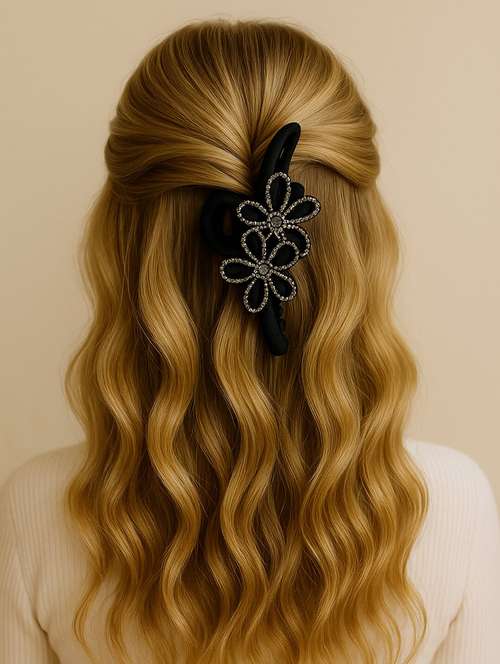This premium black crystal flower hair claw clip is designed to add instant glamour and sophistication to your hairstyle. Crafted with a soft black velvet finish and adorned with sparkling rhinestones in a delicate floral pattern, it offers a perfect balance of elegance and durability. The strong grip ensures your hair stays neatly in place, while the dazzling crystal flowers make it a stunning accessory for parties, weddings, festive occasions, or even adding a stylish touch to your everyday look. A must-have accessory for women who love chic and timeless hair styling.