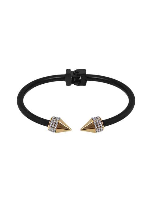 Spargz Welcomes you to Aesthetic World of Designer Jewellery Collection\nWe are using Alloy Metals with High Gold Micro Polishing. \nOur Jewellery is manufactured using is Skin friendly alloy which are Nickel and Lead Free. It doesn’t causes any rashes or allergies to the skin.\nWe are using American Diamond which is AD Stone of AA Quality for long lasting shine of Jewellery.\nFor Spargz Jewellery we are using High Gold Plating. Spargz Jewellery is Skin friendly, Nickle and Lead Free. \nPlease keep away from Water and Perfume for long lasting shine.\n\nBrand : Spargz\nCategory : Kada\nSKU : AISK_150\nMetal Type: Alloy\nPlating Type: Gold Plating\nFinish Type: Glossy\nColor : Black\nBody Structure : Cuff \nKada Width : 1 cm