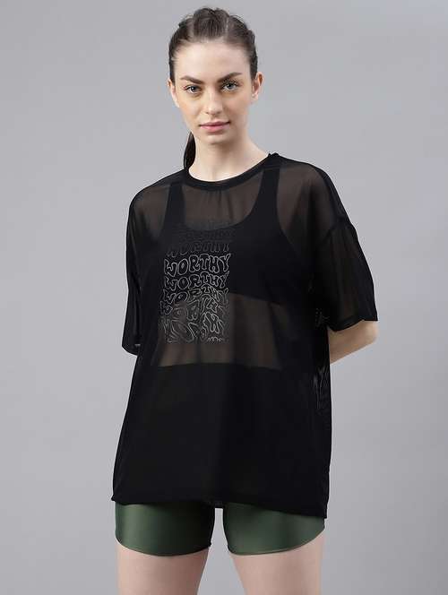 - It’s definitely not okay to be boring! So, are you ready to take things a tad bit unconventionally? Wear your tees in front print types for (active wear occasions and that too in polyester material.