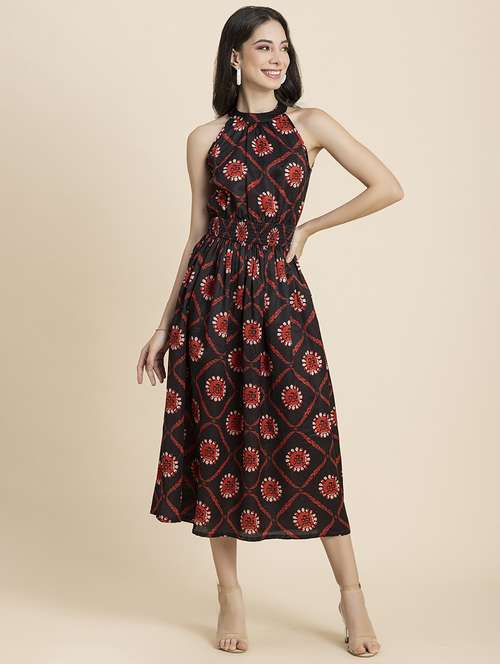 *Includes: This Clothing Consists Of 1 Dress (Any Accessories Worn By The Model Are Not For Sale)*Material: Spun Jam*Dress Length: 50 Inches (Approx.)*Model Stats: The Model In The Image Is 178 Cm Tall, And Bust 34\ Inches Is Wearing Size - (S) Small*Features: Sleeveless, Smocked Waist, Halter Neck, Fit And Flare, Calf Length, Lightweight And All Over Printed Pattern*Care: Machine Wash At 30, Tumble Dry At Low Heat, Iron On Low Temperature*Size Information: Please Refer To Our Size Chart Before Making The Purchase. If Your Size Is In Between Two Sizes, We Recommend That You Choose A Larger Size.*Tags: Dresses For Women, Midi For Women, Sleeveless Dresses For Women, Halter Neck Dresses For Women, Gown For Women, Printed Dresses For Women