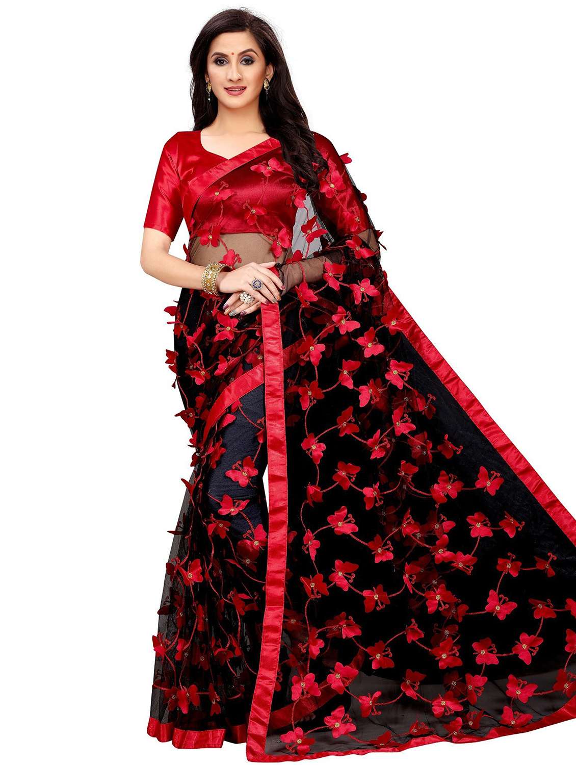 This Saree is Crafted with Butterfly over Net Fabric Having Embroidered Work on it. Saree Length is 5.25 Meter in Black Color. It's comes with a Blouse piece of 0.75 Meter. It is unstitched and can be altered according to your fit and style that you require.