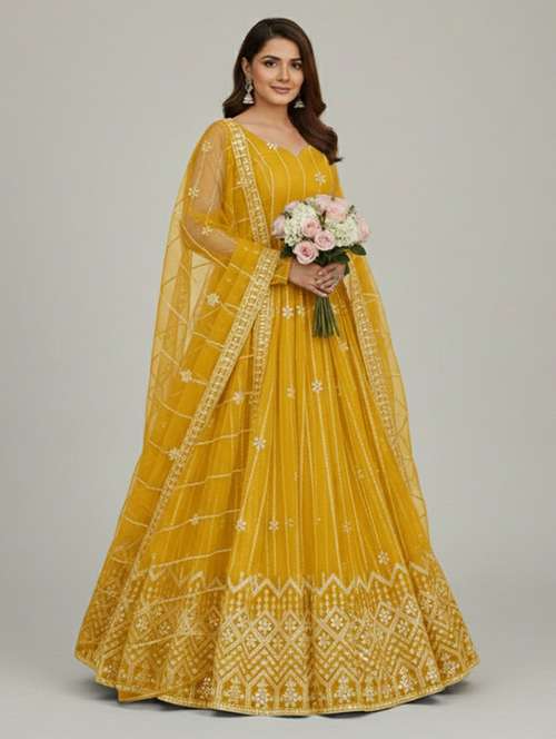 • These attractive gowns come in fit & flare made of net fabrics that can surely garner you lots of compliments when you wear it.