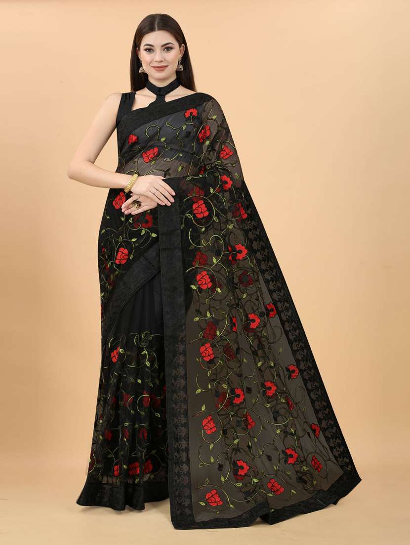 Soft Net Floral Embroidered Saree With Embroidered Border