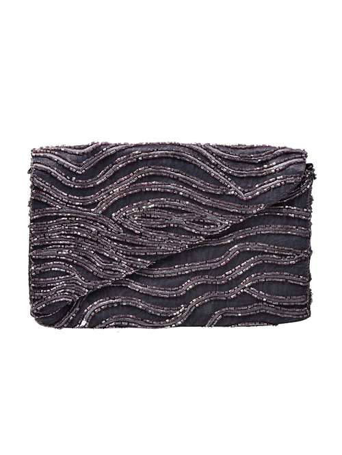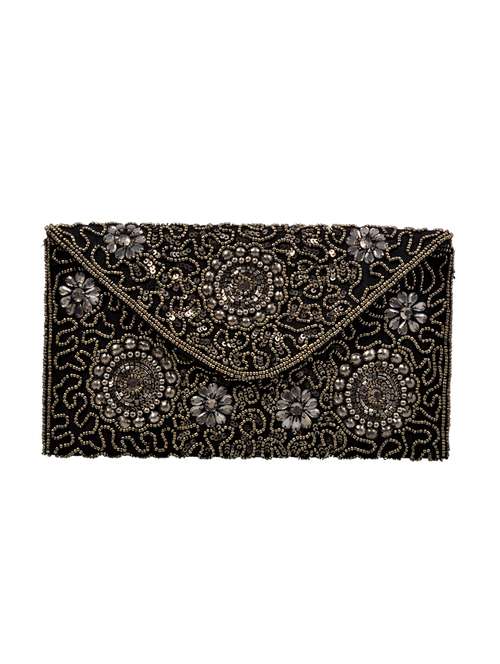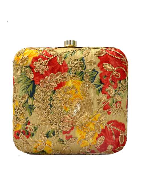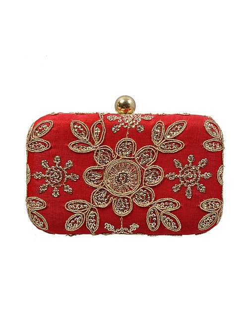 Stylish party wear clutch for women from the house of Duchess. Made from embroided and cotton inner material. Has a circular snap clasp closure type and a small pocket for coins & a larger compartment for mobile phones & other items.