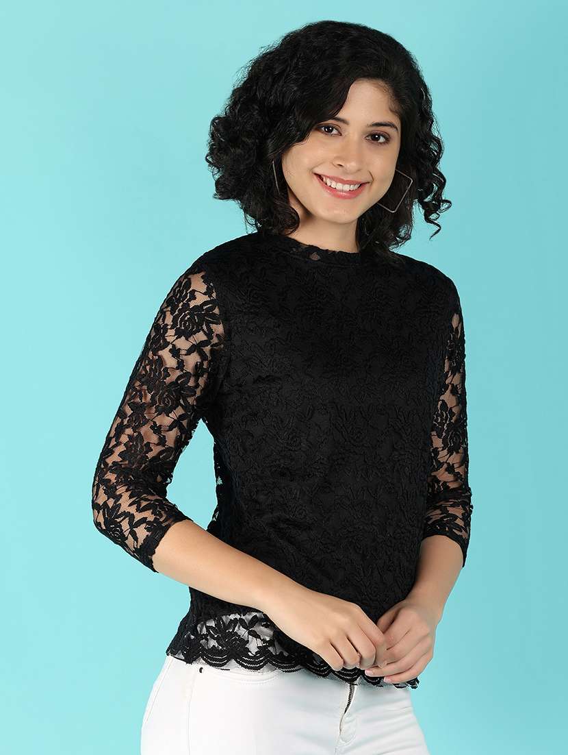 - » women black regular fit self design three quarter sleeve top