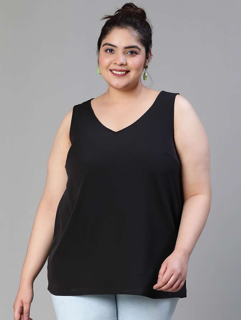 Walk into the summer style like a queen wearing this fabulous Enhanced solid black sleevless plus size women top that is super trendy, fashionable, and a classic pick for office time, to party. Designed with polyester fabric, this sleeveless top has a round neck, circular hem, and length to the hips. Pair it with nice looking blue denim or black pants to get the complete right look to wear & flaunt and make your curves groove this season.