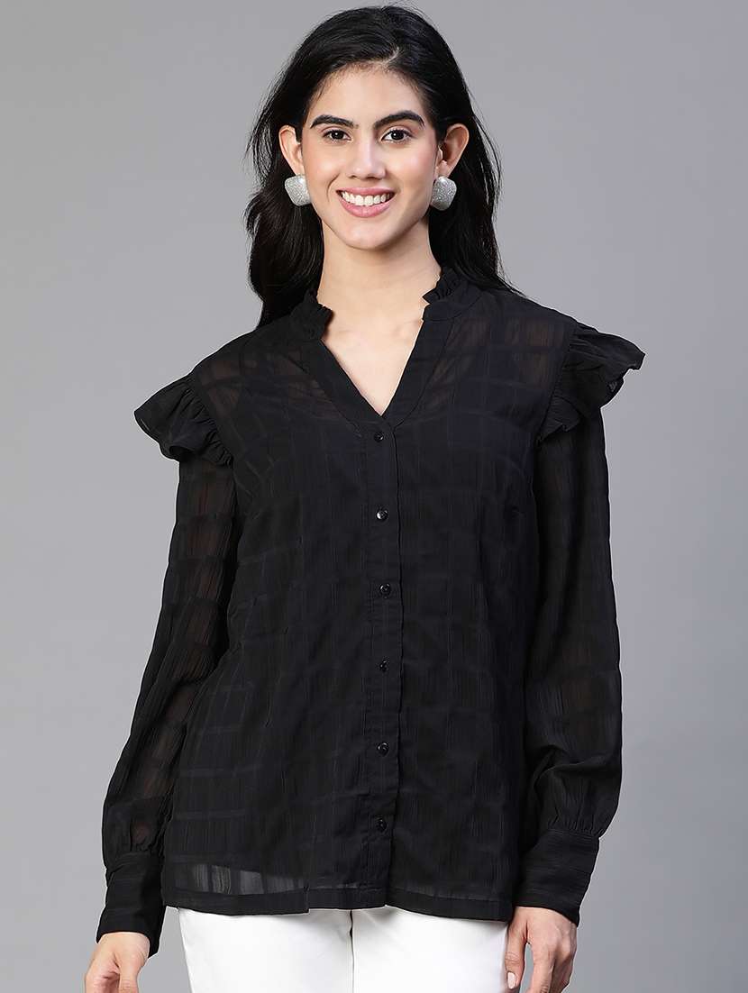 Hold the classic aura wearing this Striking black ruffled women's shirt top, that is moulded in the latest style. Made with polyester fabric, it has a comfortable fit and is wearable in all weather. It is fashioned with a v-neckline, long sleeves decked up with ruffles, a placket of black buttons and a round hem with a length to the waist. From picking this to wear in the office or on any casual occasion, this top is made for all-purpose